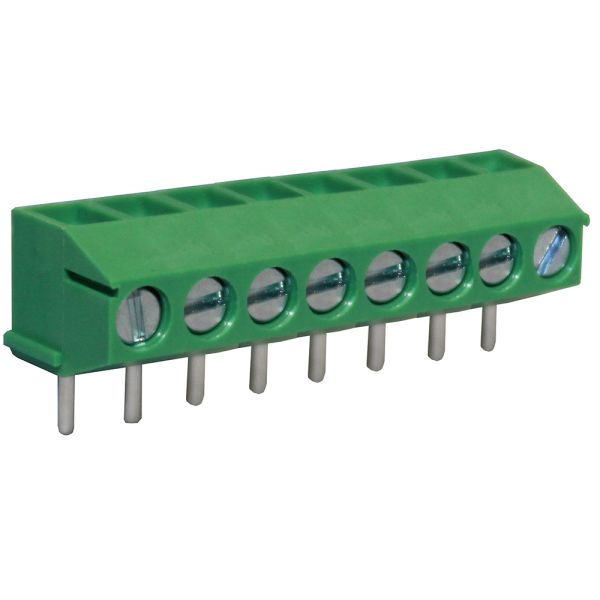 Platzsparende 8-polige Klemme mit niedrigem Profil und 3.5mm Raster. Der Kabeleingang ist um 90° abgewinkelt. Die Drähte sind durch einen zusätzlichen Kabelschutz geschützt.